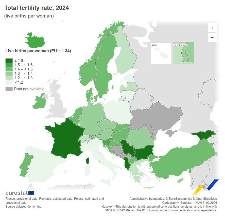 An estimated 3.55 million babies were born in the EU in 2024, a 3.3% decrease compared with 3.67 million births in 2023. The total fertility rate dropped to 1.34 live births per woman, down from 1.38 the previous year. It is the lowest figure recorded since EU-wide data became available in 2001.