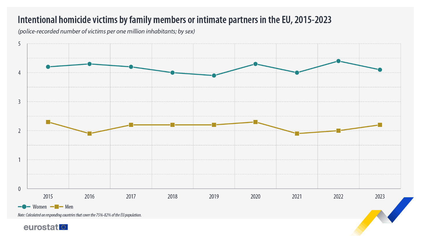 According to Eurostat data, in 2023, 4.1 women out of every million women were victims of intentional homicide, by family members or intimate partners and 63.4% of registered victims of trafficking in human beings in the EU were women or girls.