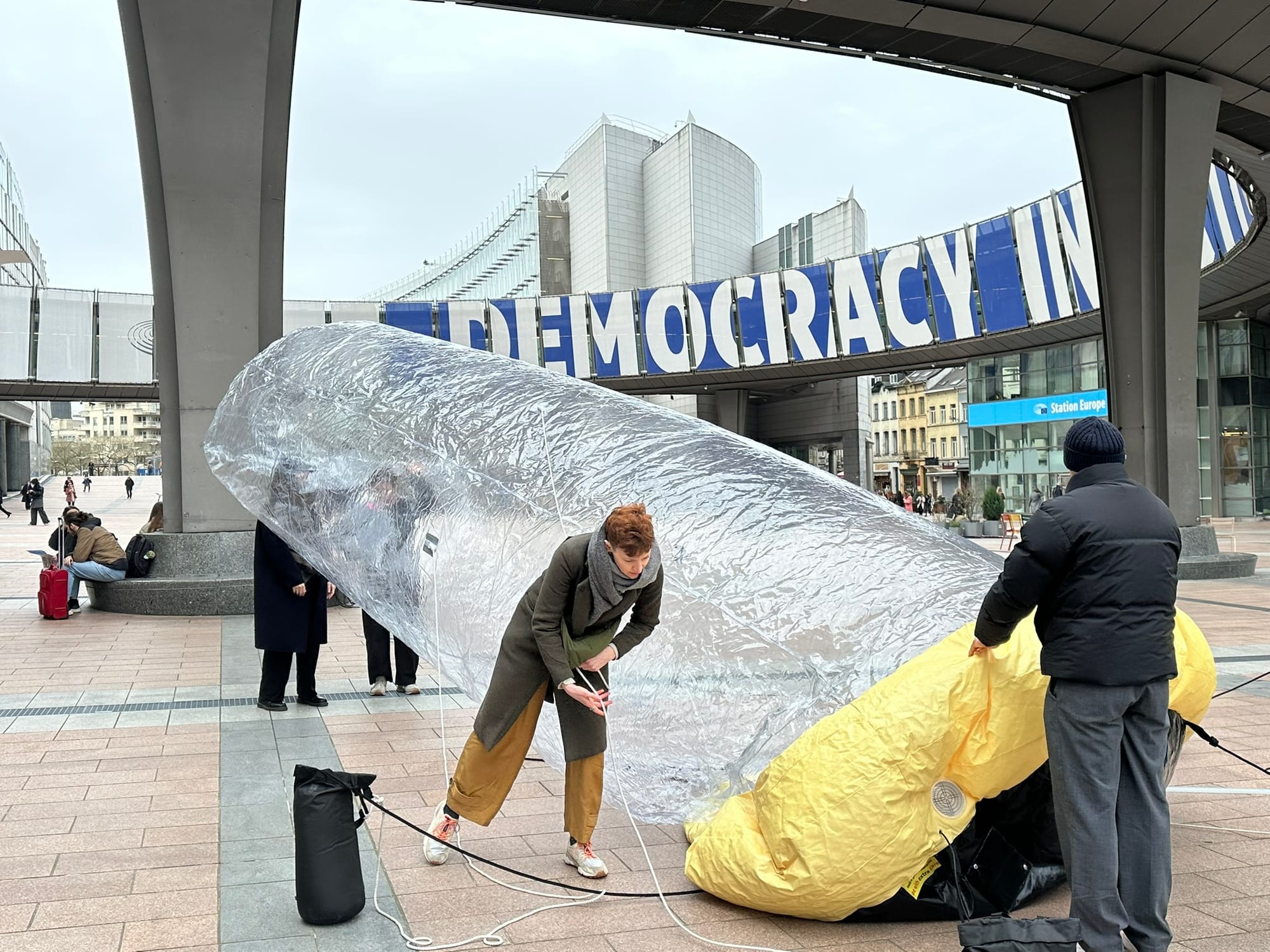 A giant condom outside the European Parliament highlights calls for EU investment in new male contraceptive options to promote shared reproductive responsibility