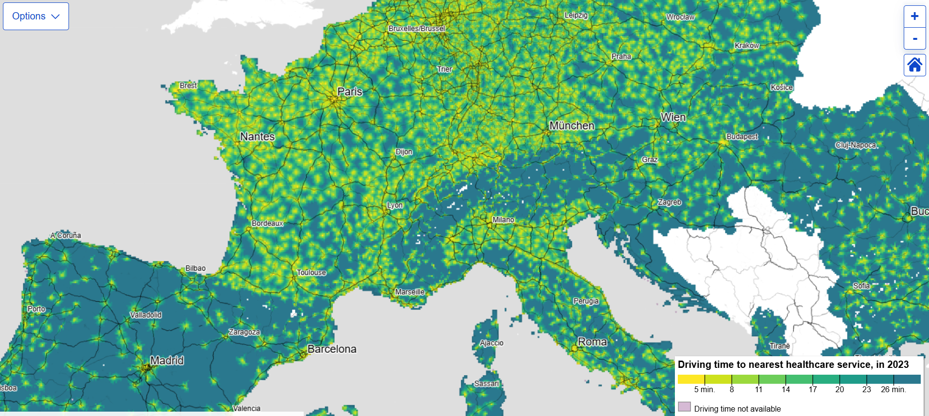Access to healthcare is a key determinant of health and a central concern of the Sustainable Development Goals. Accessibility datasets from Eurostat, published today (2 February) on a 1 km resolution grid, measure road travel time from populated places to services such as healthcare facilities, highlighting how location and transport affect access to care.