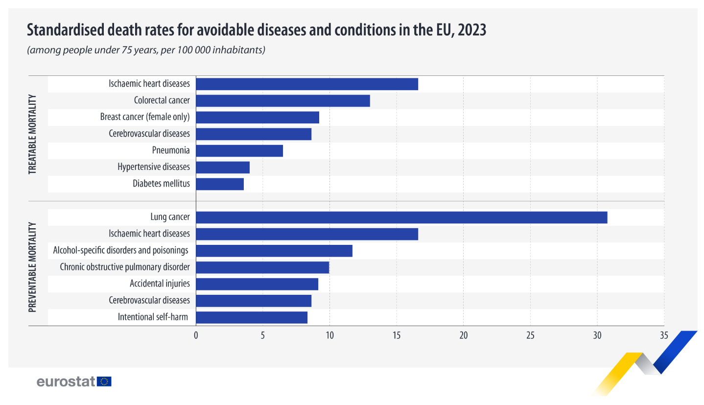 In 2023, the European Union recorded around 1 million deaths under age 75 from diseases and conditions that could have been treated or prevented, highlighting major gaps in healthcare and prevention. Around a third were treatable and two-thirds preventable causes.