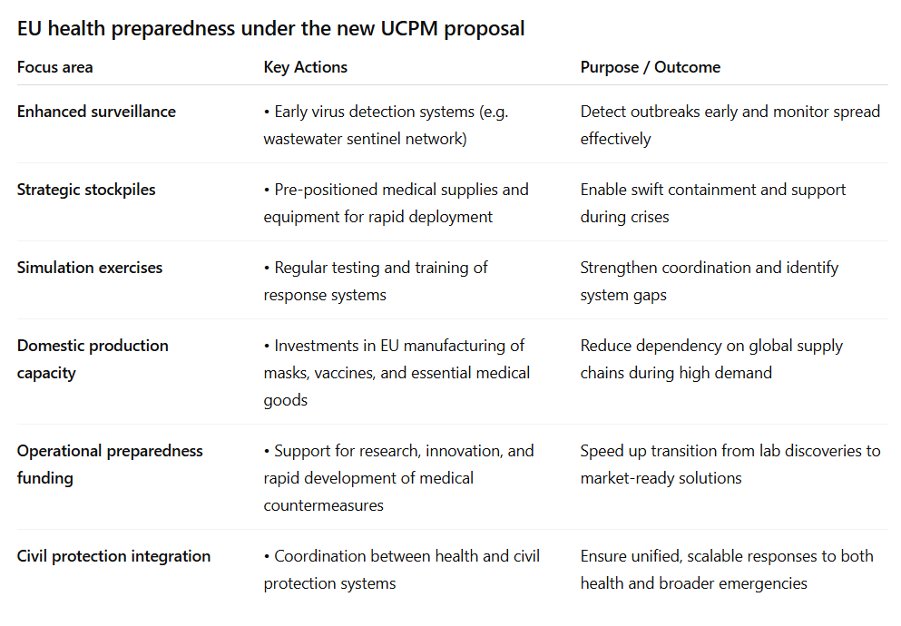 The updated UCPM aims to bring together support for civil protection for civil emergencies such as flooding and fires and health emergency preparedness. Under the proposed Multiannual Financial Framework 2028-2034, its budget is expected to increase from €3.6 billion to €10.7 billion. Part of this will come from the EU4Health programme transferring health emergency preparedness and response activities currently funded under that programme under the new mechanism.
