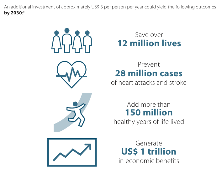 A new WHO report, ‘Saving lives, spending less’, estimates that investing just three dollars (€ 2.5) per person annually on proven measures could save 12 million lives, prevent 28 million heart attacks and strokes, and deliver over US$1 trillion in economic benefits by 2030.