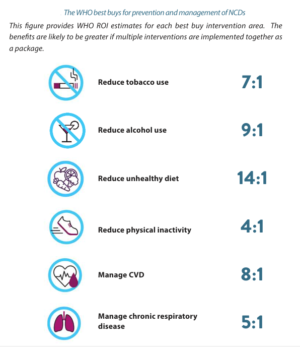 The report lists 29 ‘Best Buys’, including both prevention (reduce tobacco use, alcohol use, unhealthy diet and physical inactivity) and management (manage cardiovascular disease, chronic respiratory disease and cancer).